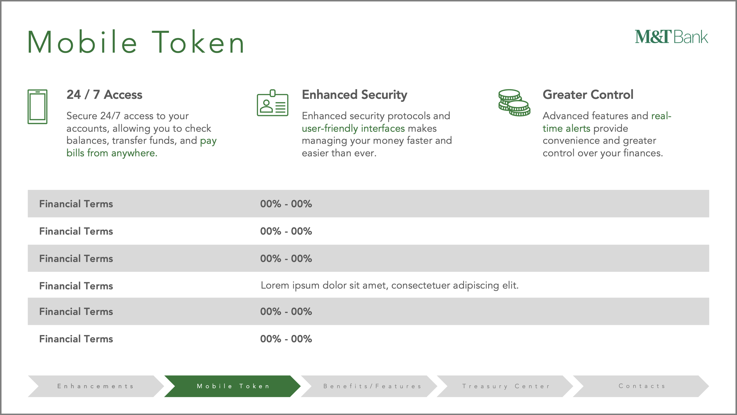 A sales presentation for the Treasury Management division of a leading U.S. bank, featuring consistent colors, visuals, and iconography that align with the bank’s brand identity. The presentation clearly communicates facts, figures, and key messages in a way that’s easy for the client to grasp.